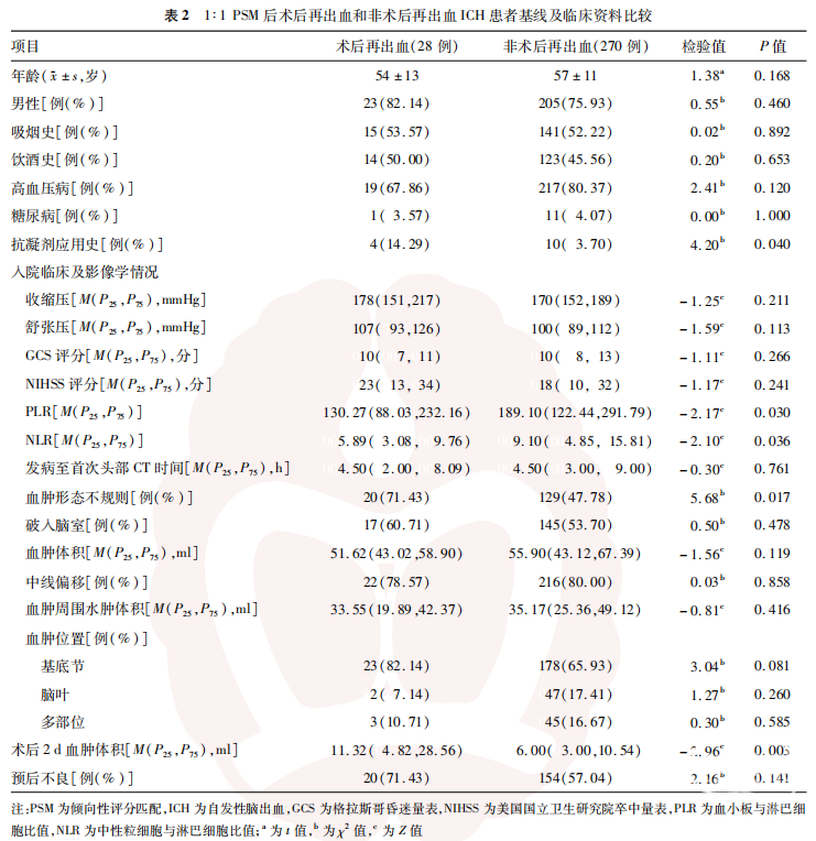 PSM后术后再出血患者28例(9.4%),非术后再出血患者270例(90.6%),两组间有抗凝剂应用史的患者比例、术后2d血肿体积及入院PLR、入院NLR、入院CT血肿形态不规则患者比例差异均有统计学意义(均P<0.05),余基线及临床资料差异均无统计学意义(均P>0.05)。见表2。
