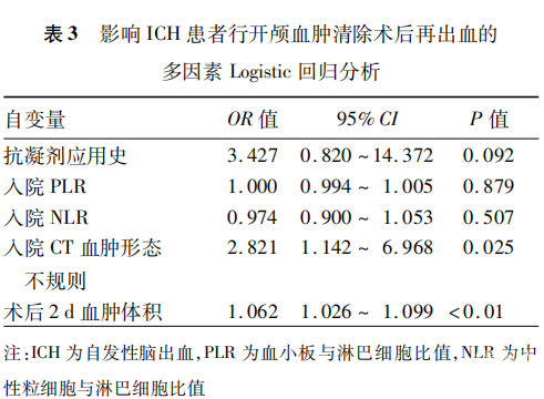 以术后再出血为因变量,将术后再出血与非术后再出血患者比较中P<0.05的因素作为自变量行多因素Logistic回归分析,结果显示,入院CT血肿形态不规则(OR=2.821,95% CI:1.142~6.968,P= 0.025)及术后2d血肿体积大(OR=1.062,95% CI:1.026~1.099,P< 0.01)是ICH患者行开颅血肿清除术后再出血的独立危险因素。见表3。
