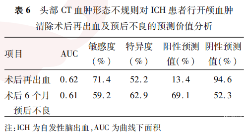 入院CT血肿形态不规则预测ICH患者行开颅血肿清除术后再出血的AUC为0.62,敏感度和特异度分别为71.4%、52.2%;入院CT血肿形态不规则预测ICH患者行开颅血肿清除术后预后不良的AUC为0.61,敏感度和特异度分别为59.2%、62.9%。见图2,表6。