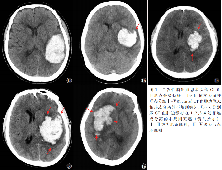 基于ICH患者入院头部CT评估血肿形态、血肿位置、血肿体积、血肿周围水肿体积、中线是否偏移、是否破入脑室。通过评估入院头部CT血肿边缘是否存在相连或分离的不规则突起对血肿形态进行分级,无相连或分离的不规则突起为Ⅰ级,存在1~4处相连或分离的不规则突起分别对应Ⅱ~Ⅴ级,Ⅰ~Ⅱ级为形态规则,Ⅲ~Ⅴ级为形态不规则[16]。见图1。由2名神经外科副主任医师独立对每例患者的血肿形态进行评估,意见不一致时由1名影像科主任医师进行最终判断。使用多田公式[17]计算血肿体积及血肿周围水肿体积。以透明隔偏移>4mm为中线偏移[18]。