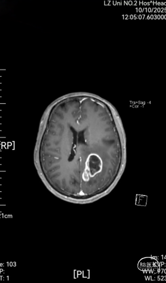 ➤ 颅脑MRI平扫,增强及MRS结果:双侧大脑半球对称,灰白质比例正常,左侧顶叶见囊实性长T1长T2信号影,实性成分呈稍长T1稍长T2信号,T2-FLAIR及DWI呈稍高信号,增强后呈边缘明显环形强化,大小约29mm×48mm×46mm,周围脑实质见斑片状稍长T1稍长T2水肿信号影,左侧侧脑室轻度受压变窄;MRS示双侧海马区Cho峰明显升高,NAA峰无明显降低。双侧半卵圆中心及侧脑室旁可见散在斑片状稍长T1稍长T2信号,T2-FLAIR呈稍高信号,DWI呈等信号,边界模糊,增强后未见强化。各脑室,脑池大小形态正常,中线结构居中,幕下小脑,脑干无异常,矢状面扫描示垂体大小形态正常,强化均匀。颅脑MRA示双侧颈内动脉,大脑中动脉,大脑前动脉及大脑后动脉及其分支走行略僵硬,管壁毛糙,无明显局灶性增粗或变细。颅脑MRV示上矢状窦,直窦,窦汇,横窦及乙状窦显示良好,走行连续,未见明显增粗或狭窄。
