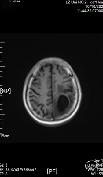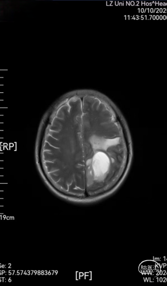 ➤ 病史简介:患者于入院前半月无明显诱因出现右侧肢体无力,症状逐渐加重,遂至医院就诊,行头颅平扫CT示:1. 左侧顶叶占位,周围水肿,脑疝形成,建议颅脑MRI平扫,增强及MRS进一步检查;2. 脑白质脱髓鞘病变,现患者为求进一步诊治,就诊于我院,门诊以“颅内占位性病变”收住入院。患者自患病以来神志清,精神可,无发热,头晕头痛,咳嗽咳痰,胸闷气短,恶心呕吐,腹痛腹泻,乏力盗汗等不适,饮食睡眠良好,二便如常,近期体重未见明显增减。