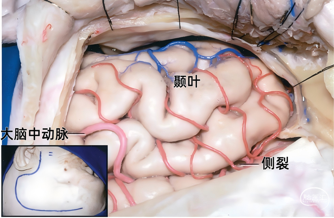 下图示骨瓣和硬脑膜切开后显露颞叶和中颅窝底。