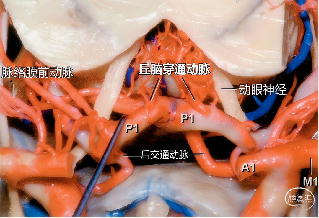 下图示成对的丘脑穿支动脉。右侧丘脑穿通支与脉络丛后内侧动脉共干。