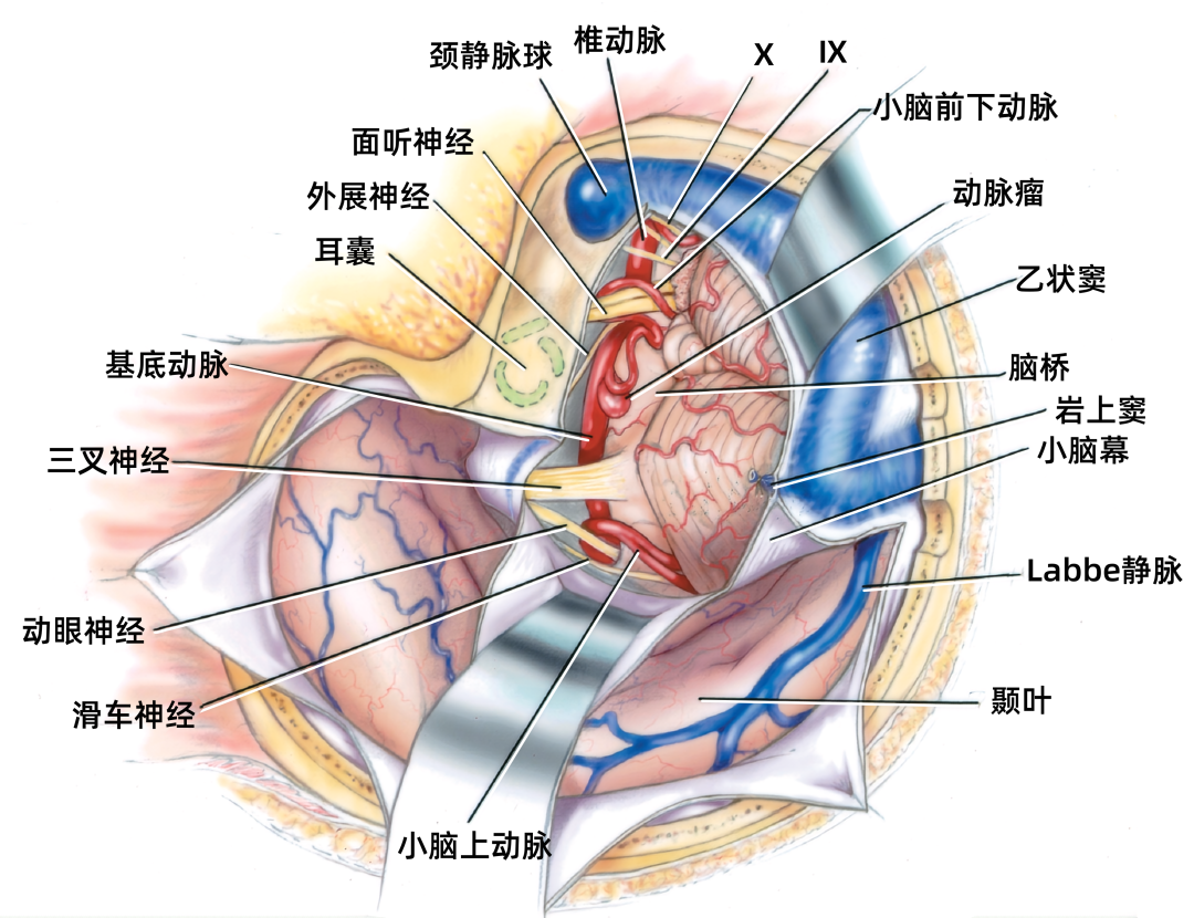 下图示暴露幕上和幕下区域。乳突切除已完成,小心保护耳囊和半规管骨质。在乙状窦前切开硬脑膜,经过岩上窦至小脑幕缘,并注意保护滑车神经,暴露椎动脉上部和基底动脉的全长。颈静脉球有可能阻碍到达椎动脉颅内段的下部。抬起颞叶时要注意保护好Labbé静脉。
