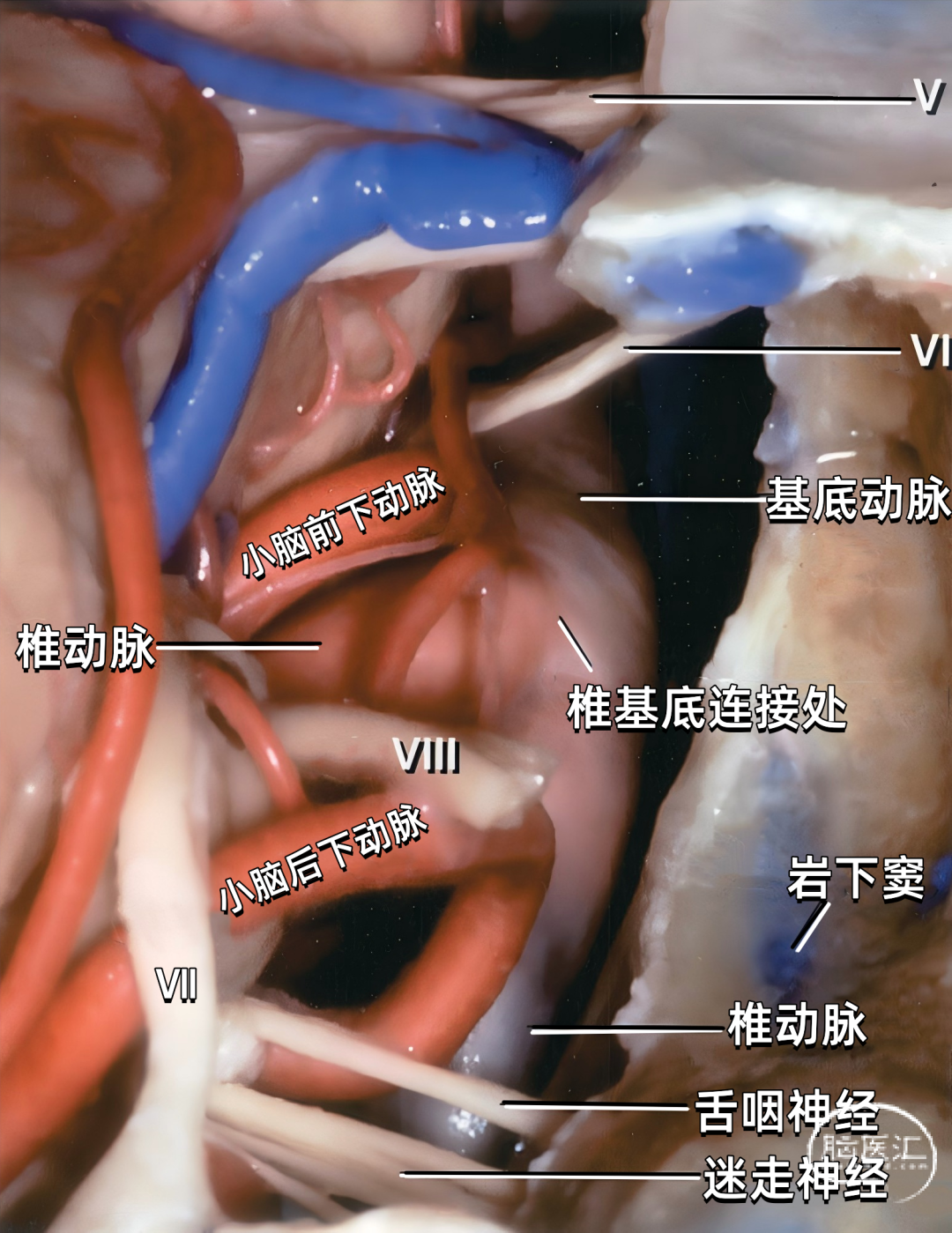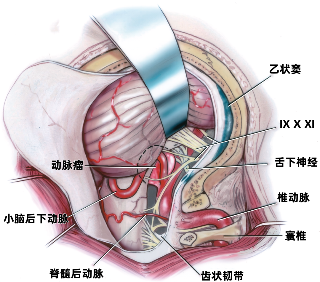 下图示低位椎动脉起源的小脑后下动脉动脉瘤。动脉瘤位于脑干的前方,小脑后下动脉和椎动脉之间。舌咽神经、迷走神经、副神经和舌下神经也被暴露。