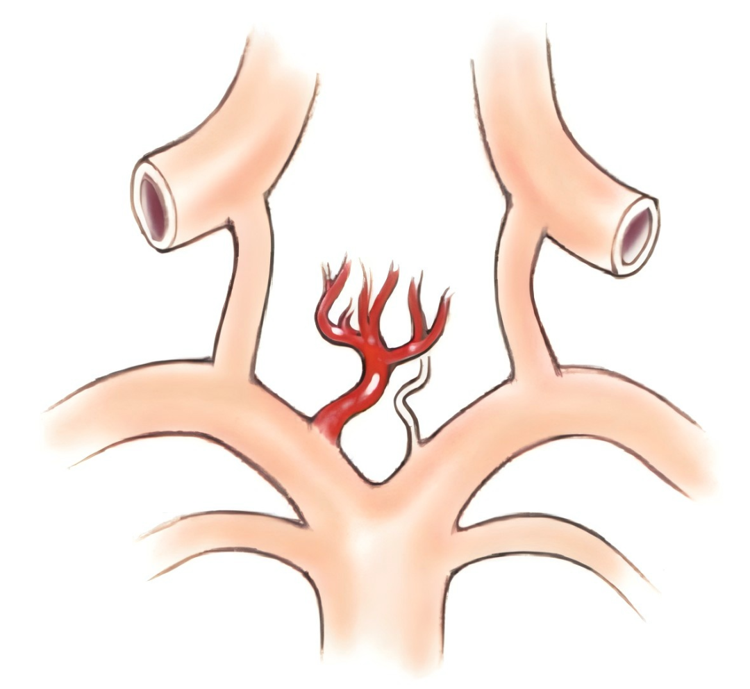 基底动脉尖动脉瘤发生在基底动脉发出大脑后动脉处,沿着基底动脉的长轴突向上方。动脉瘤发生的位置与垂直的基底动脉和侧方的大脑后动脉之间形成的弧度有关。