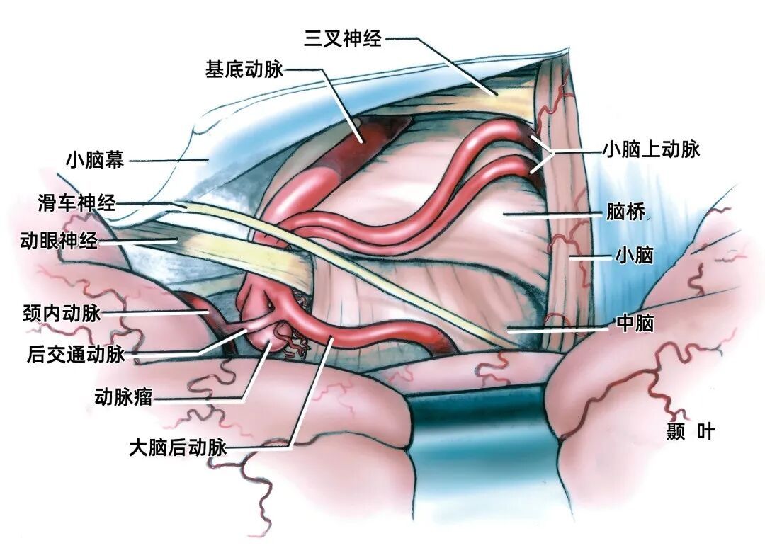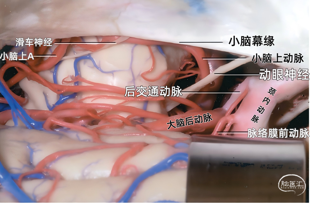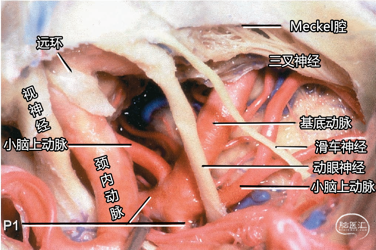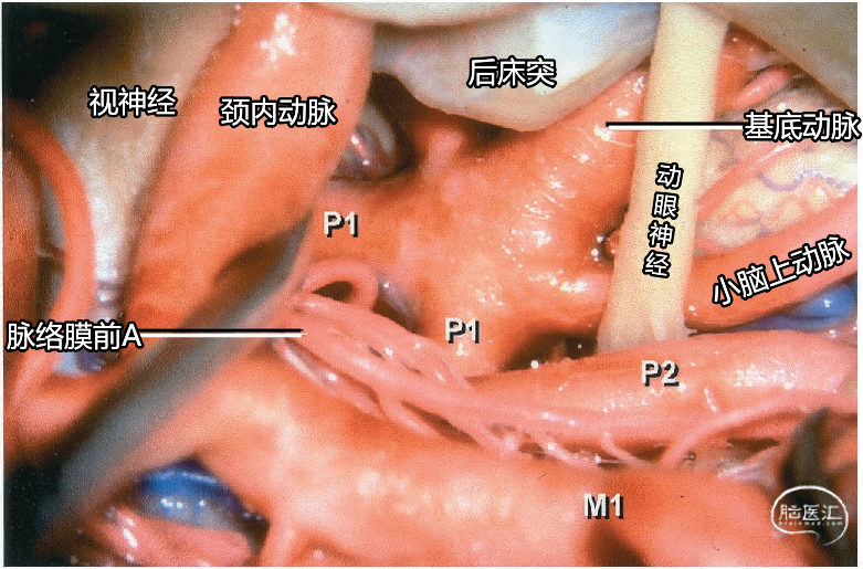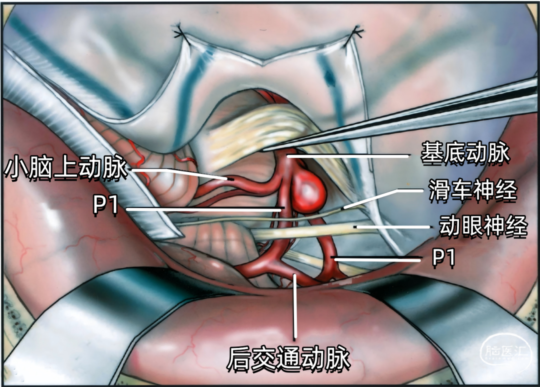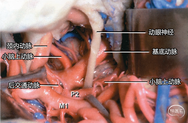 其他同时暴露的结构包括:基底动脉、大脑后动脉、后交通动脉、丘脑穿支动脉、小脑上动脉、回返动脉,以及嗅束和视束。大脑后动脉P1段从基底动脉发出到与后交通动脉相连。