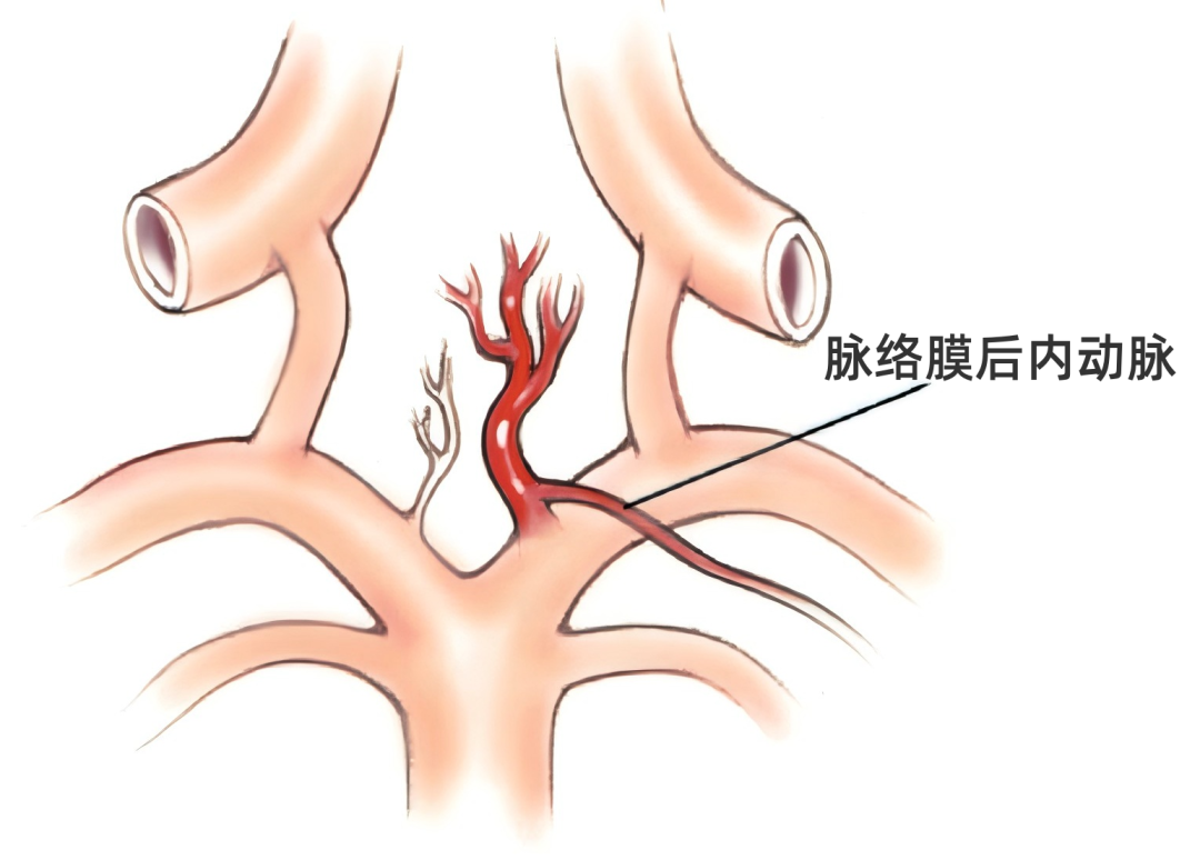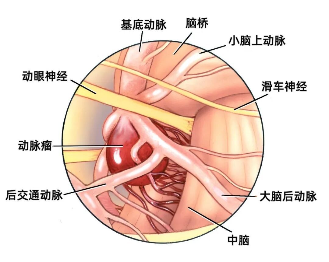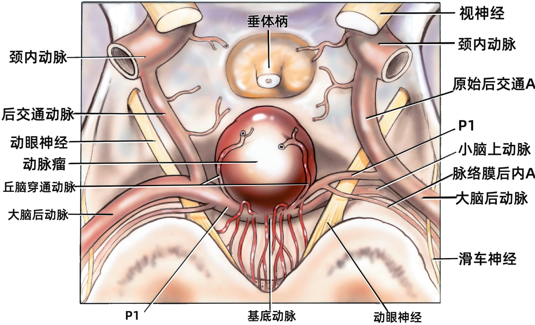 Willis环后部发出一系列穿支血管进入间脑和中脑,有可能被基底动脉尖动脉瘤所牵拉,其中最重要和最粗大的是起自基底动脉瘤附近大脑后动脉P1段的丘脑穿通动脉。它们起自P1段,在乳头体的后方、穿大脑脚内侧脚间窝的后穿质入脑,它们大多数既是P1段的分支,也是最接近分叉的分支。