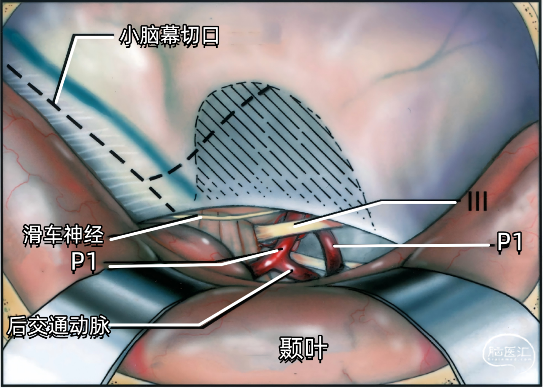 下图示抬起颞叶,在滑车神经进入小脑幕缘的后方切开小脑幕(虚线),硬脑膜切口向前延伸至岩骨切除区。大脑后动脉的P1段、后交通动脉、动眼神经,以及滑车神经暴露于小脑幕的内侧缘。