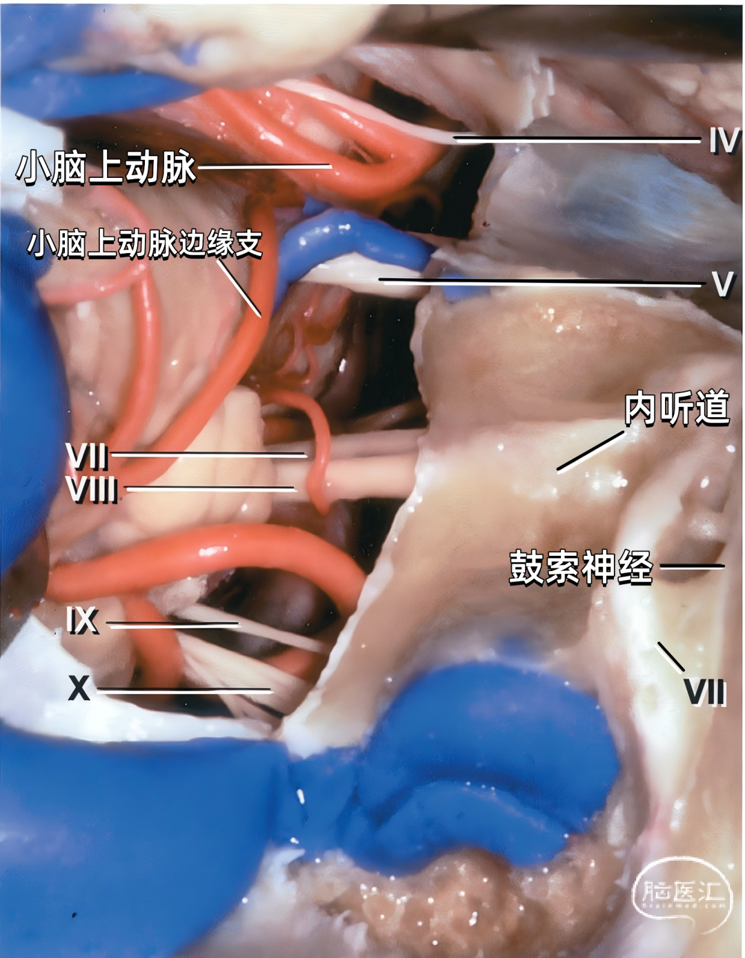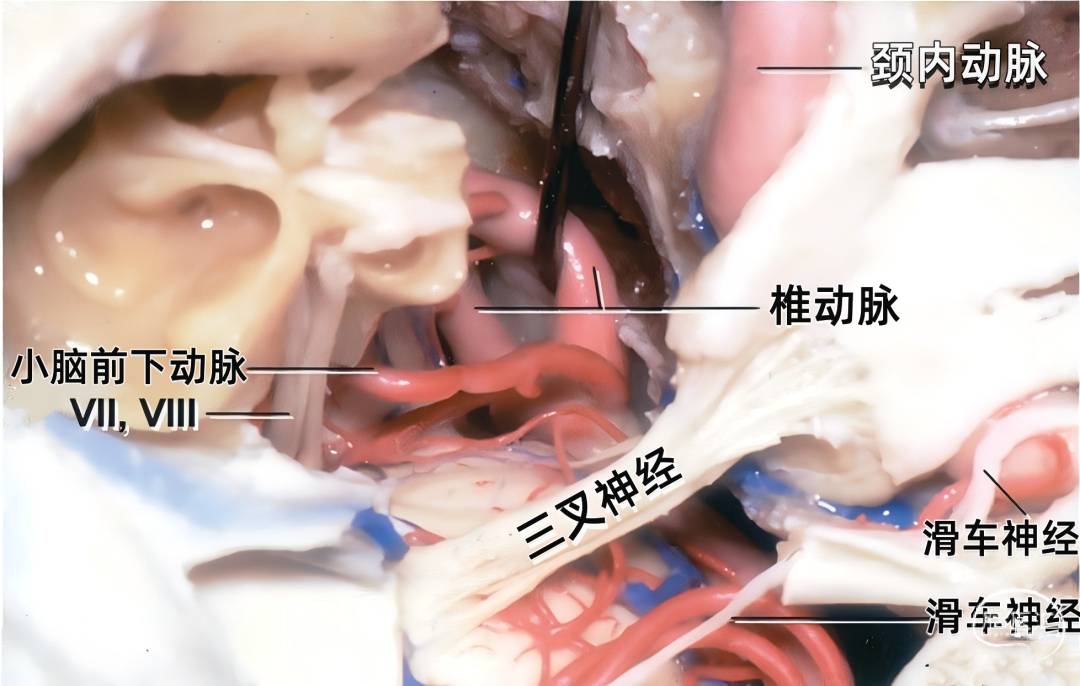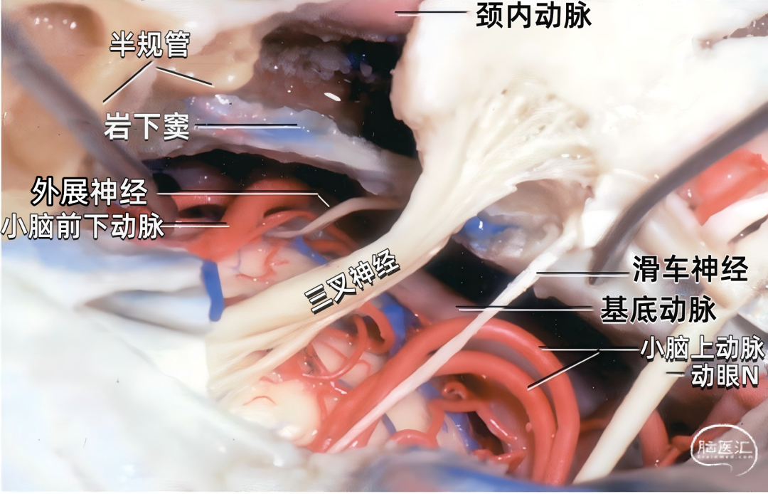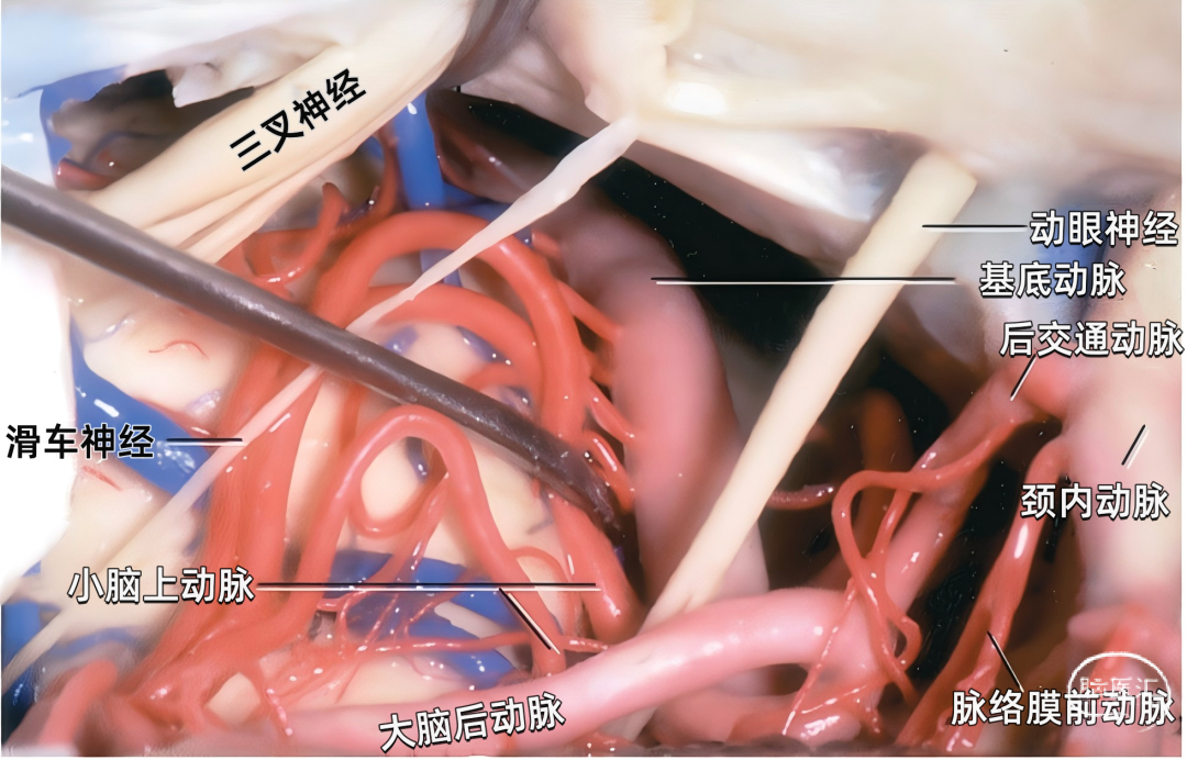 下图示在岩骨嵴后方切开小脑幕,暴露基底动脉上部、小脑上动脉、三叉神经和滑车神经,脉络膜后内侧动脉也围绕脑干侧方走行。