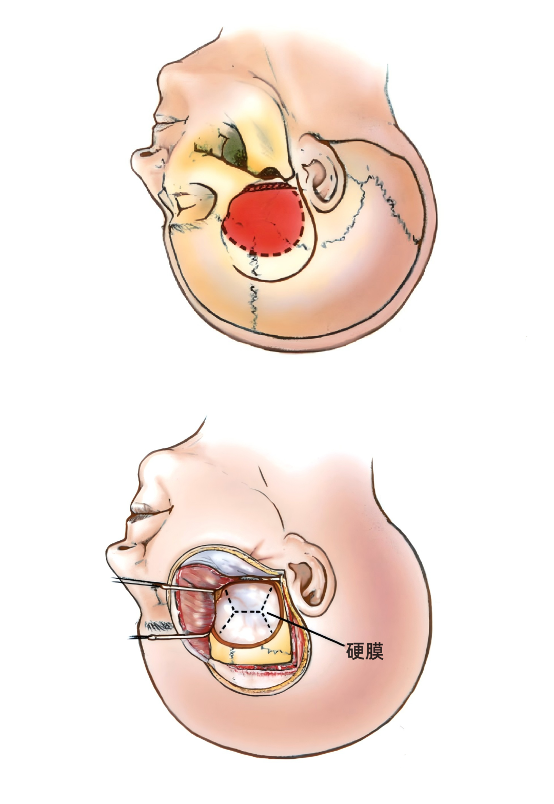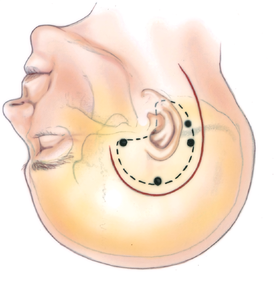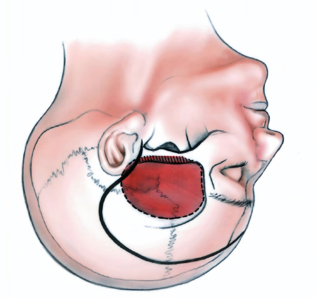 下图示翻开问号样头皮切口(图中实线),骨瓣尽量靠近中颅窝底(图中虚线内阴影部分)。切除部分骨窗下缘的颅骨和颧弓上缘(图中斜线区)增加中颅窝底的暴露。