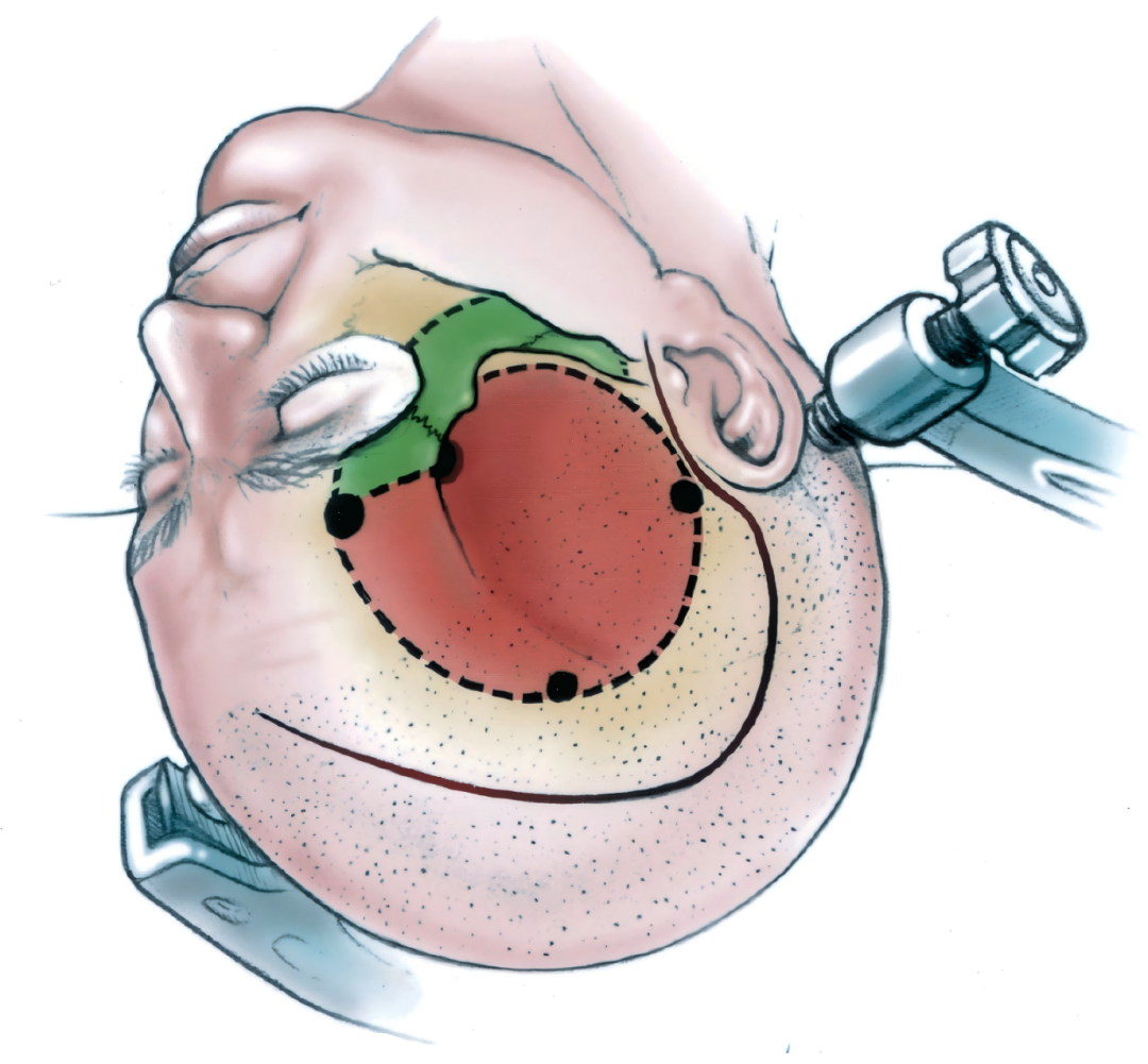 下图示眶颧经海绵窦入路的头位和颅眶颧开颅的部位。首先游离额颞骨瓣(红色)为第一片,眶颧骨切开(绿色)为第二片。两骨片入路比把两骨片作为一片开颅有可能保留更多的眶顶。