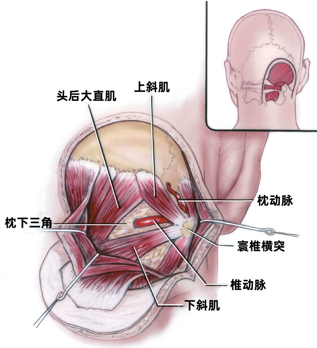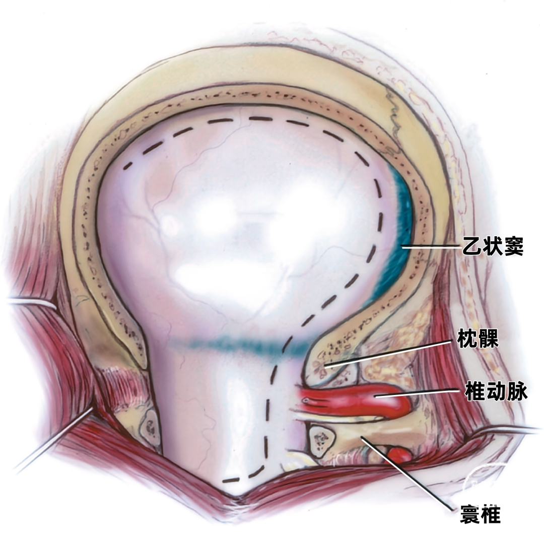 下图示远外侧入路处理小脑后下动脉椎动脉瘤。图中除构成枕下三角各边的肌肉外,所有的枕下肌肉连同头皮一起翻向下方。