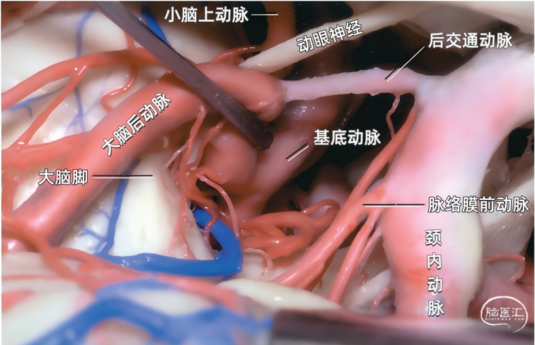 下图示剥离子压低大脑后动脉暴露基底动脉。脉络膜前动脉起自颈内动脉,经大脑脚和钩回之间进入颞角。