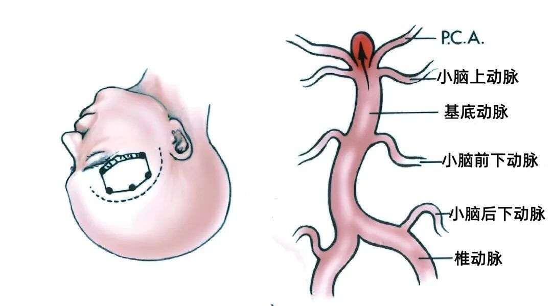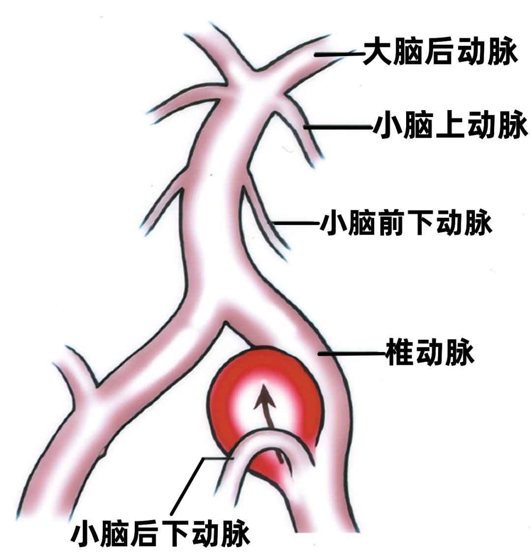 在小脑上动脉或小脑前下动脉的起点起自基底动脉的动脉瘤,或在小脑后下动脉起点的位置起自椎动脉的动脉瘤,由于基底动脉和椎动脉并不是笔直的,反而大多数是迂曲的,其内血流方向由于血管的弯曲发生了变化,靠近小脑动脉起始部的基底动脉和椎动脉壁形成了血流动力学改变,动脉瘤指向受累分支起点没有弯曲时的血液流动方向。