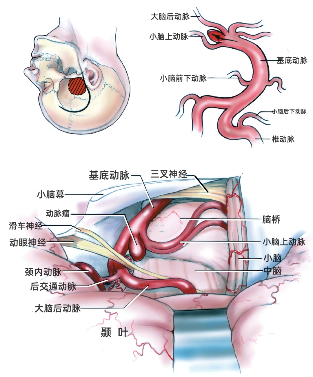 基底动脉瘤位于大脑后动脉和小脑上动脉之间(上图)、基底动脉尖端(下图),以及位于小脑前下动脉的起始部(下图)。