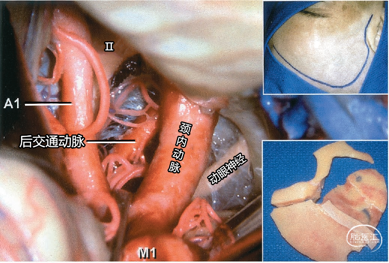 下方插图显示皮肤切口,右下方的插图为双骨片眶颧开颅。牵开额叶和颞叶显露视神经、动眼神经、大脑前动脉、大脑中动脉和后交通动脉。