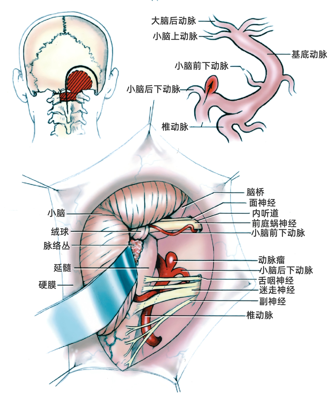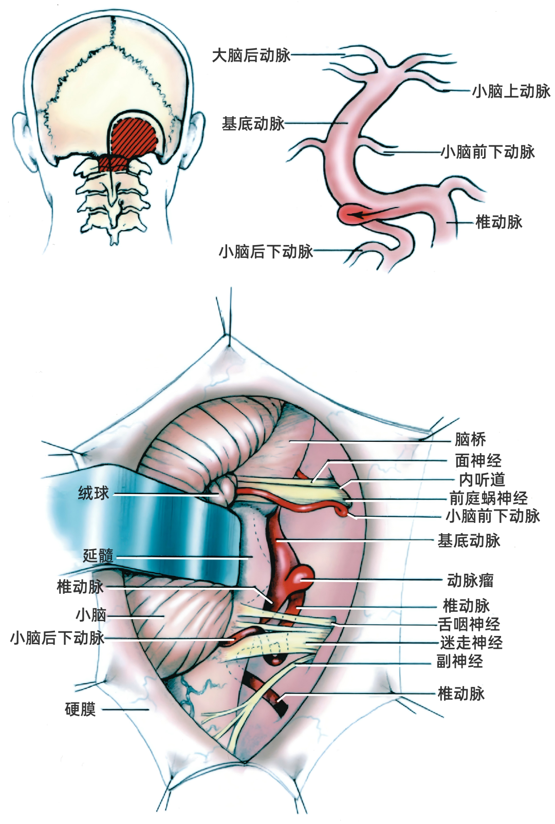 对于小脑后下动脉起始处的椎动脉动脉瘤,如果动脉瘤位置低,可选择枕下外侧入路或远外侧入路;如果动脉瘤位于后颅窝中部、位置深在,可选择乙状窦前联合幕上、下入路。