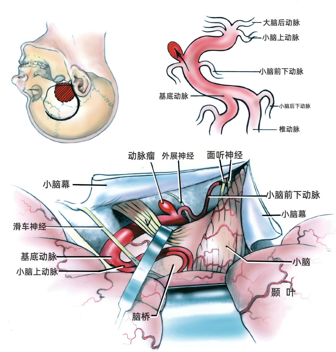 下图示经颞下入路显露小脑前下动脉起始部基底动脉瘤。展神经位于小脑前下动脉的下方。在三叉神经上方切开小脑幕,暴露面神经和前庭蜗神经。基底动脉弯曲产生的血流动力学改变(箭头所示)作用于基底动脉和小脑前下动脉之间连接处的血管壁。
