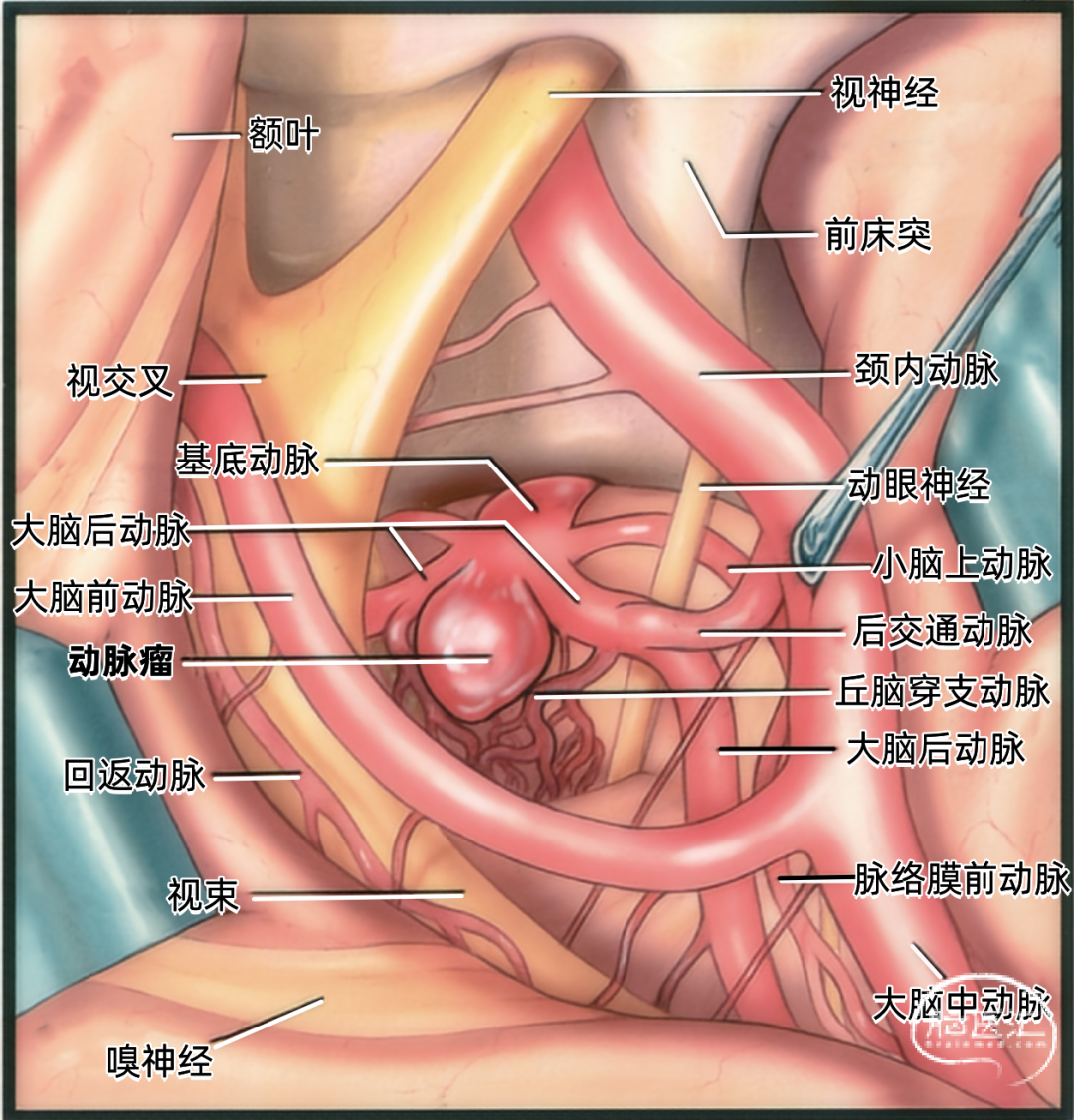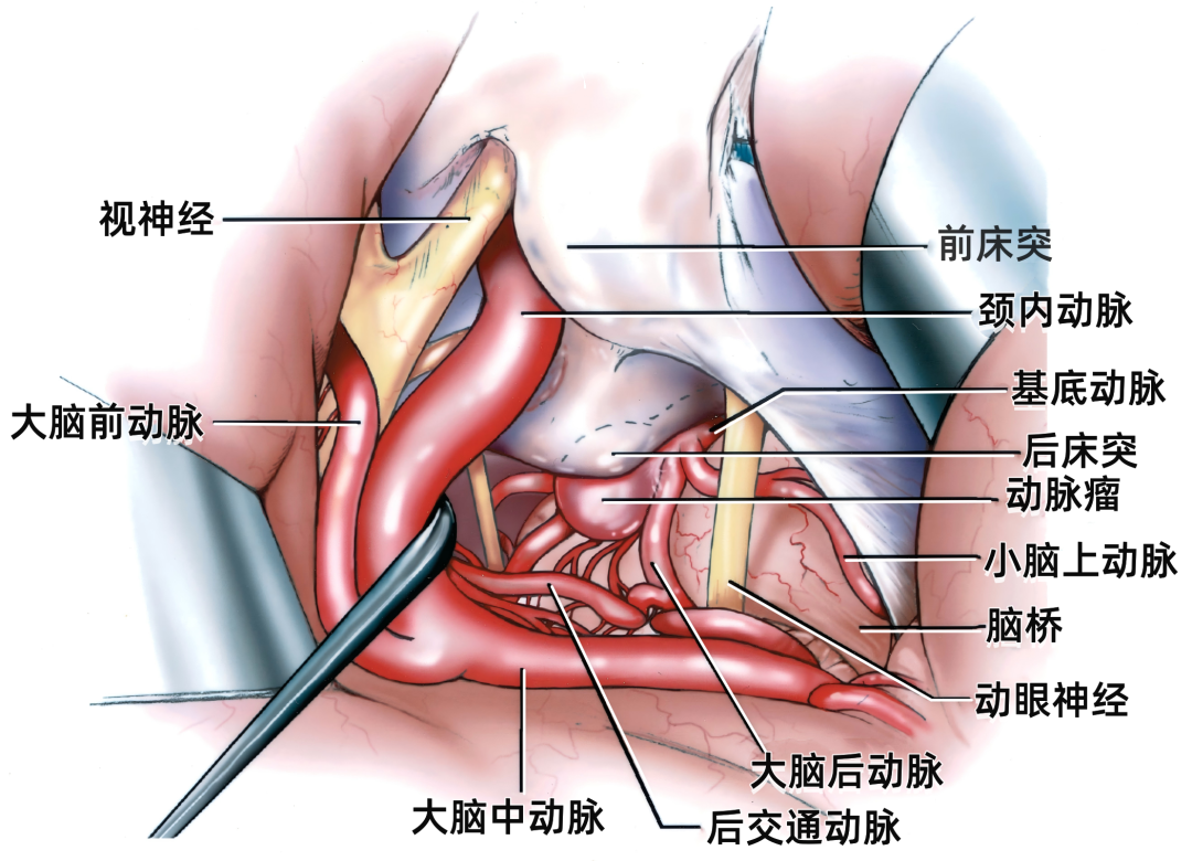 下图示翼点入路显露基底动脉尖动脉瘤。分开侧裂,牵拉额叶和颞叶,显露动脉瘤。同时显露颈内动脉、大脑前动脉、大脑中动脉、视神经和动眼神经,以及前床突。