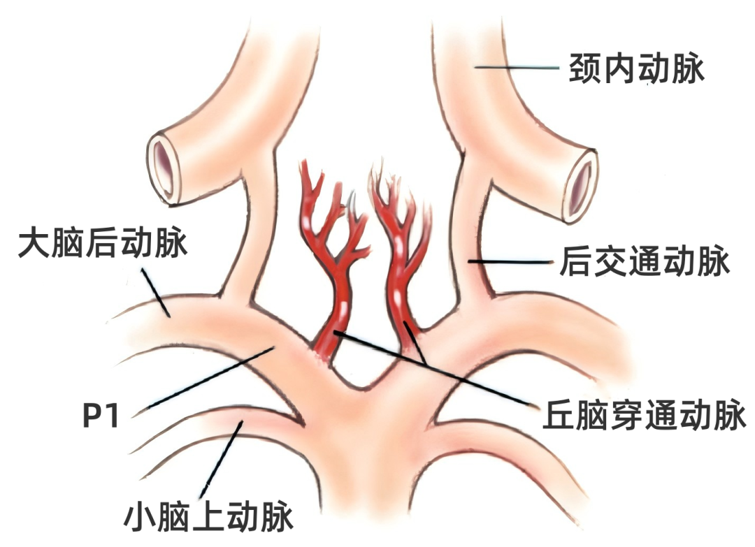 大脑后动脉P1段也有可能不发出丘脑穿通动脉,此时,对侧发育良好或优势侧的丘脑穿通动脉参与供应平时由两P1段分支供血的区域。这些重要的穿支血管发生闭塞可出现包括视力丧失、瘫痪、躯体感觉异常、肌力下降、记忆缺失、自主神经和内分泌失衡、运动异常、复视和意识障碍。