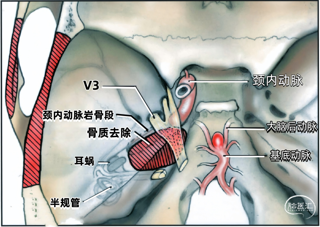如果是低位基底动脉尖动脉瘤,单纯切开小脑幕暴露基底动脉的长度不够,我们可以先在硬膜外磨除位于颈内动脉岩骨段之后、内听道之前、耳蜗内侧、三叉神经下方的岩骨尖部(下图)。切除骨窗下缘颅骨和颧弓上缘(图中斜线区)以增加中颅窝底的暴露。