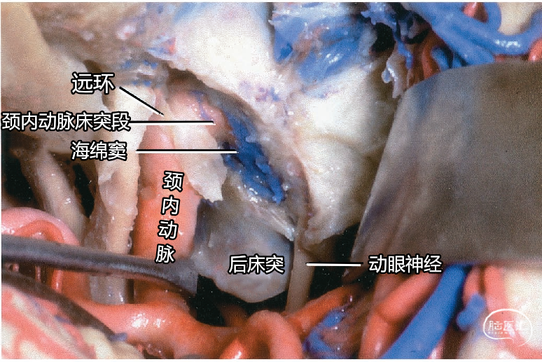 下图示磨除前床突,暴露颈内动脉床突段和海绵窦顶部,海绵窦顶部的硬膜切开至后床突水平,提供到达颈内动脉床突段及后床突的通路。硬膜远环自前床突上缘,向内侧延伸。
