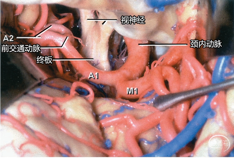 下图示经视交叉上方向内侧显露前交通动脉区域。