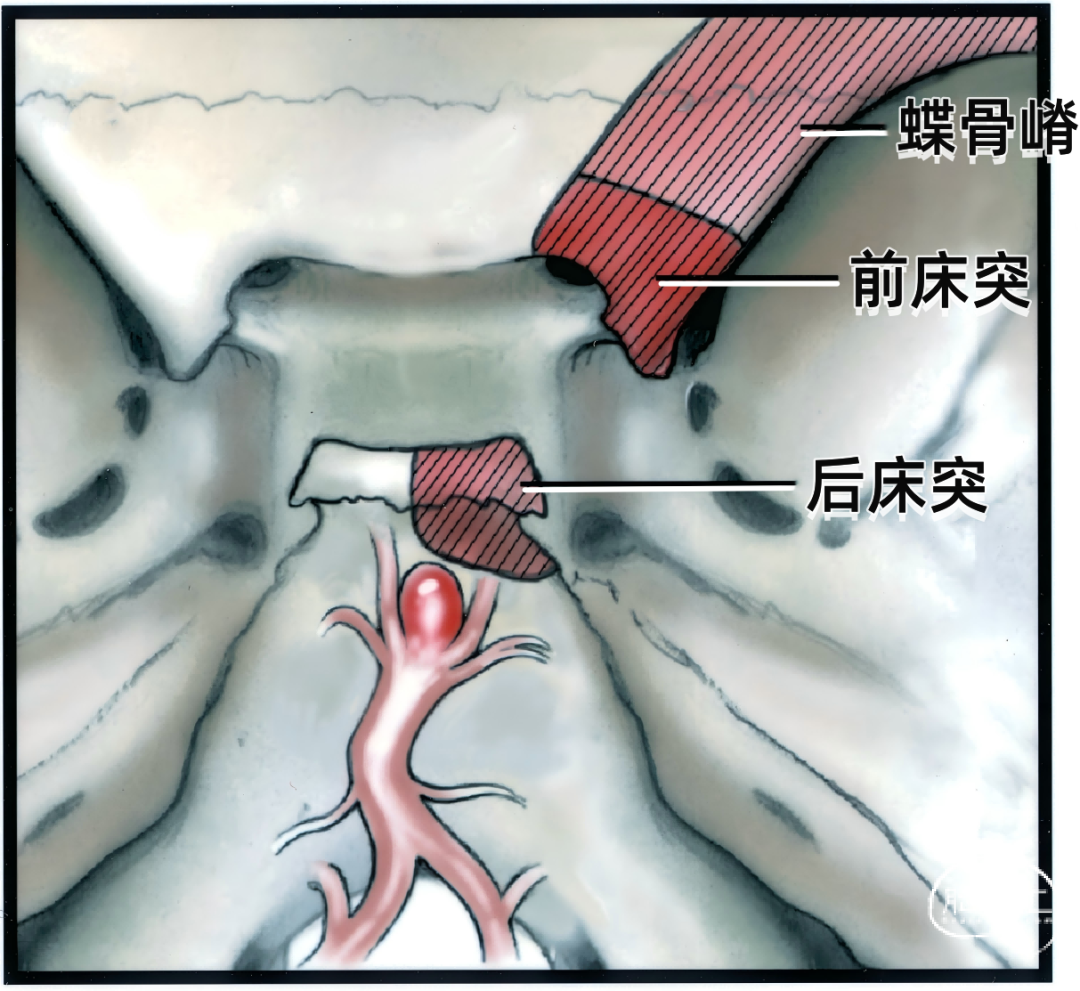 下图示骨切除(红色阴影区)可以包括:蝶骨嵴、前床突、后床突及邻近的鞍背。