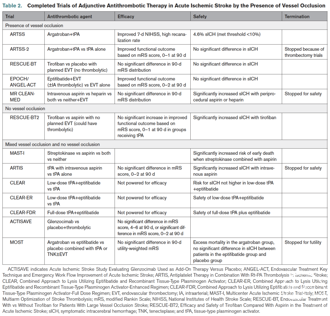 MOST与ACTISAVE研究凸显了在急性卒中标准再灌注治疗基础上联合辅助抗血栓治疗未能带来显著获益。这些试验所纳入的高选择性药物虽在理论上较传统药物更具疗效优势,却未能实质性改善临床结局。在溶栓或取栓治疗基础上联用抗血小板药物至多仅具边际效益,而联用抗凝药物则可能产生危害。