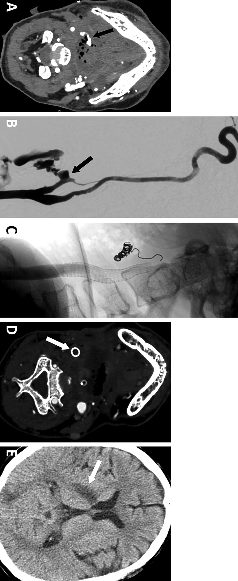 示例三. A,一名49岁口咽癌男性患者,全喉切除术、气管造口术及甲状腺切除术后。末次化疗后出现大量口腔出血伴低血容量性休克。CTA显示右侧面动脉活动性造影剂外渗,伴周围含气坏死组织(箭头所示)。B,血管造影显示右侧面动脉残端活动性造影剂外渗(箭头所示)。C,经覆膜支架植入术处理颈总动脉-颈内动脉,并行右侧颈外动脉圈陷术(采用可推入弹簧圈)后状态。D、E,术后2周颅脑CTA检查,显示覆膜支架内血栓形成及右侧大脑新发梗死灶(箭头所示):
