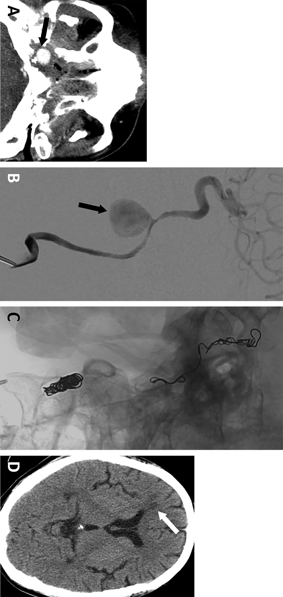 示例二. A,一名48岁右侧口咽癌男性患者,呕血及右侧鼻衄。CTA显示右侧岩段颈内动脉假性动脉瘤形成(箭头所示)。B,血管造影显示右侧岩段颈内动脉假性动脉瘤,无活动性出血(箭头所示)。C,右侧颈内动脉圈陷术后状态(采用可推入弹簧圈)。D,右侧颈内动脉圈陷术后2天颅脑平扫CT,显示右侧额叶白质新发梗死灶(箭头所示):