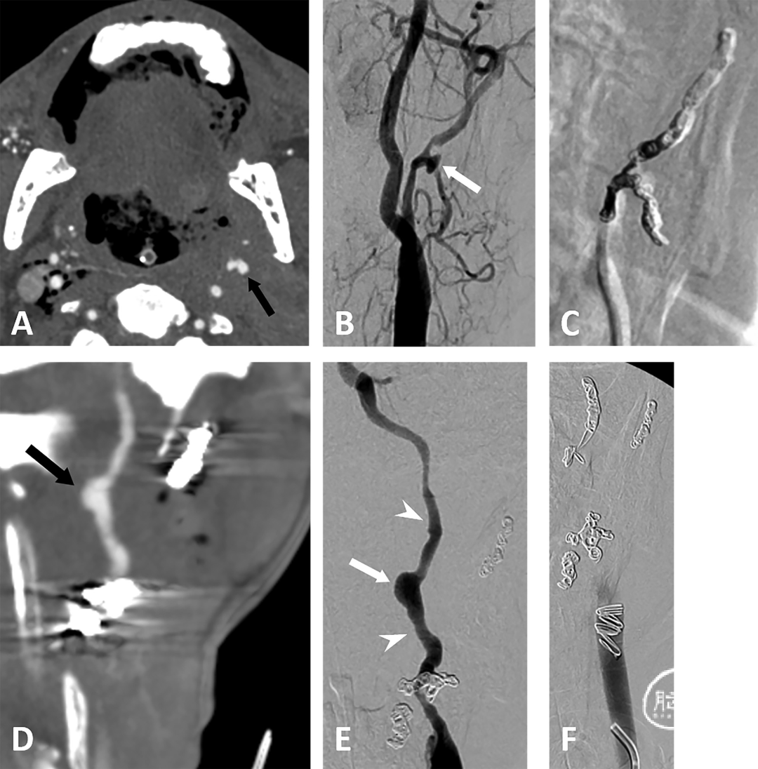 示例一. A,一名67岁左侧扁桃体癌男性患者,突发大量呕血。CTA显示肿瘤包绕左侧颈段颈内动脉及颈外动脉,并在颈外动脉处形成假性动脉瘤(箭头所示)。B,血管造影显示左颈外动脉近舌动脉开口处假性动脉瘤,无活动性造影剂外渗(箭头所示)。C,左颈外动脉圈陷术后状态(采用可推入弹簧圈,trapping with pushable coils)。D,左颈外动脉圈陷术4个月后再次发生呕血。CTA显示肿瘤体积增大,并在左颈段颈内动脉处形成新发假性动脉瘤(箭头所示)。E,血管造影显示左颈段颈内动脉假性动脉瘤(箭头),伴颈内动脉管壁不规整(箭号)。F,左颈总动脉及颈内动脉圈陷术后状态(采用可推入弹簧圈):