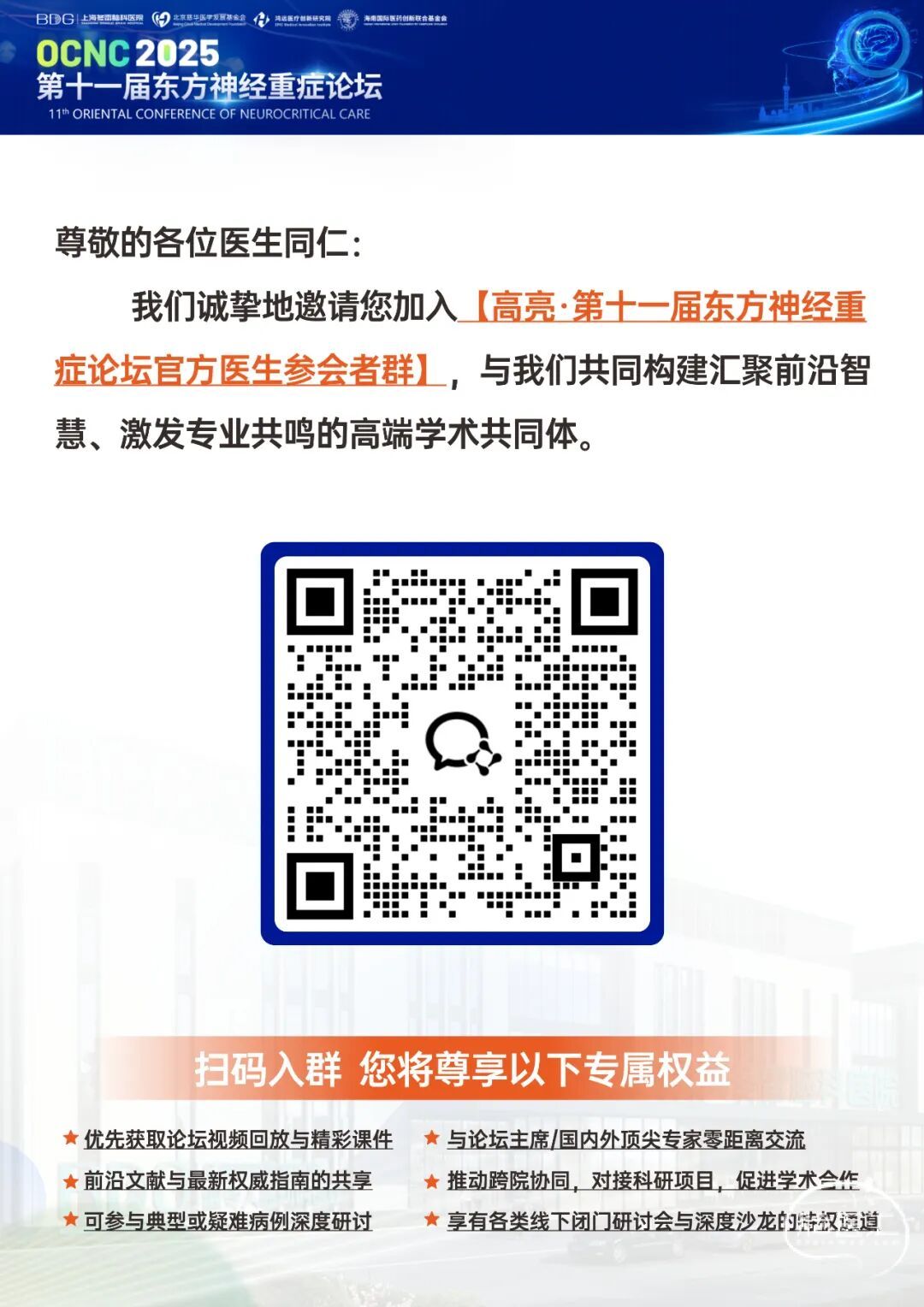除此之外,还有天坛、华山、华西、宣武、协和、瑞金、仁济、湘雅、浙一、浙二等百余家三甲医院神经外科、重症医学、神经康复、重症护理多学科实战专家齐聚。诚邀您扫码进入大会官方医生专属社群,与先锋同侪共筑神经重症学术共同体,实时获取前沿诊疗洞见。