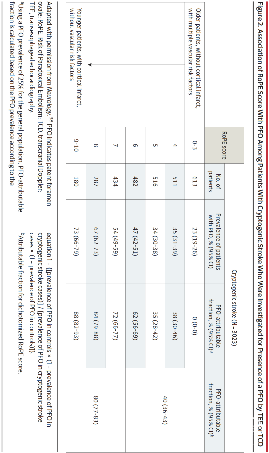 图2.在接受经食管超声或经颅多普勒检测PFO的隐源性卒中患者中,RoPE评分与PFO的关联性