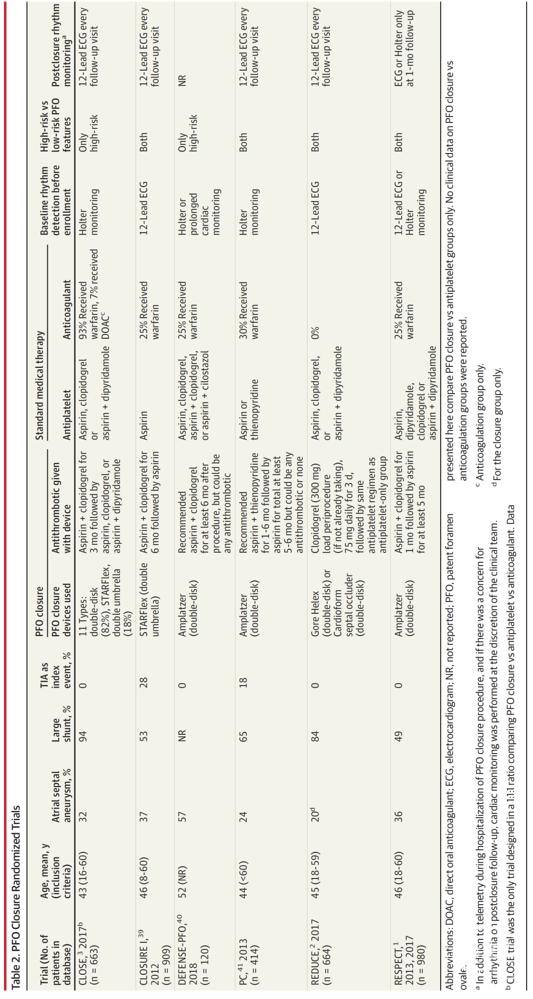 PFO相关性卒中因果可能性分类系统(PFO-Associated Stroke Causal Likelihood (PASCAL))整合了RoPE评分和超声心动图发现,其中高风险解剖特征定义为大分流和/或房间隔瘤(表1下部)。根据该分类系统,PFO被视为隐源性卒中的"很可能"、"可能"或"不太可能"病因。