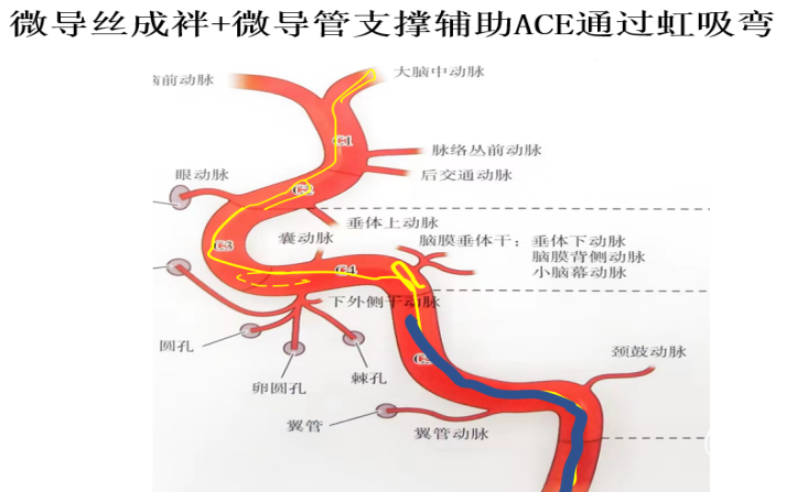 ACE抽吸导管头端柔软,在血管条件好的情况下直接缓慢上推裸奔节省时间。但在眼动脉段弯道容易损伤眼动脉,所以在海绵段和眼动脉部位要小心通过。