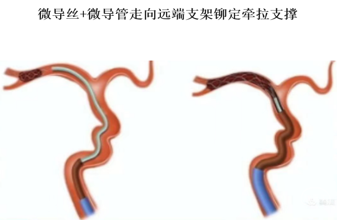 B、微导丝+微导管辅助+支架铆定下牵拉抽吸导管到位。(下图所示):