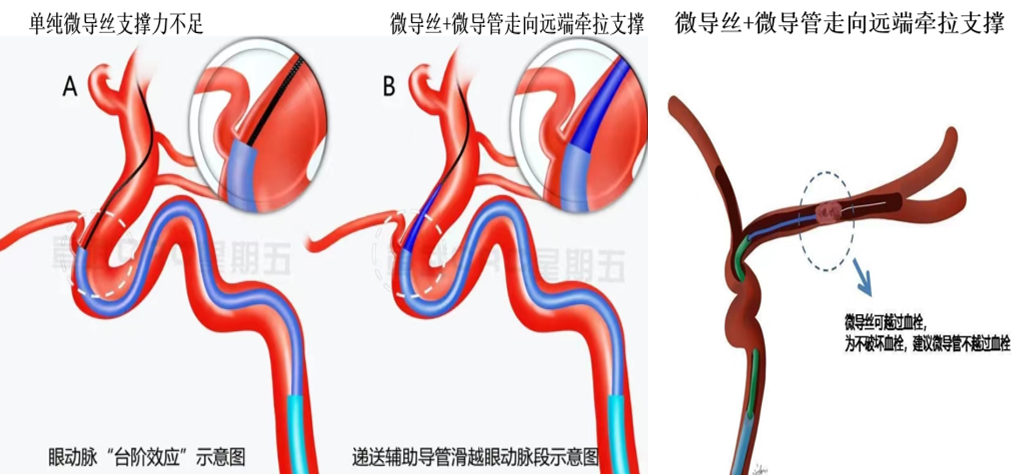 C、微导丝回头弯+微导管辅助牵拉抽吸导管通过眼动脉窗台技术要点: