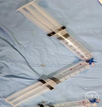 踹马桶抽吸: “猛抽”将血栓吸入导管,进行快速踹、踹、踹马桶,注射器无回血,边踹负压抽吸,撤出体外,检查中间导管和注射器抽出2块红色血栓,冒烟观察血管再通。