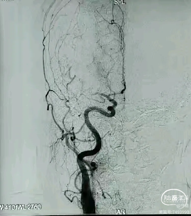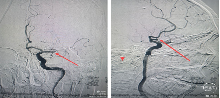 2.脑血管造影示:右侧大脑中动脉M1以远末显示,副大脑中动脉有少量供血。M1段似有血栓影