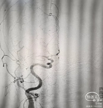 局麻下行血管内治疗:行右侧股动脉穿刺,脑血管造影真实左侧大脑中动脉M1段闭塞。血管断面呈“刀切征”or“截断征”。大脑前动脉部分代偿。