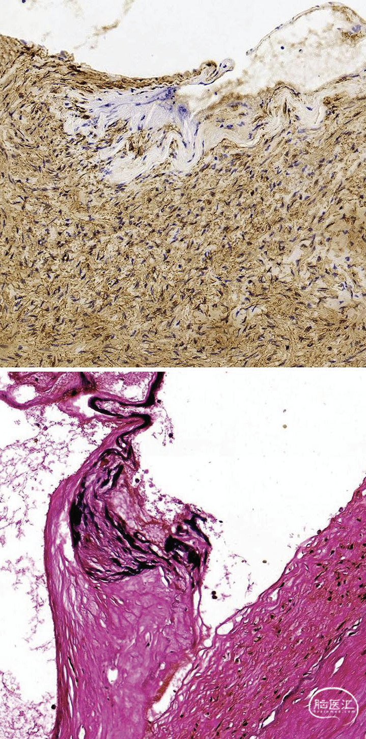 术后患者意识完全清醒,NIHSS评分降至6分。病理分析显示:首次抽取的暗红色血栓为混合性血栓,而后续导致充盈缺损的灰色软组织包含动脉壁成分,经平滑肌肌动蛋白免疫组化染色及弹力纤维染色确认(图2A、B)。住院10天后出院时神经系统检查正常,改良Rankin量表和NIHSS评分均为0分。