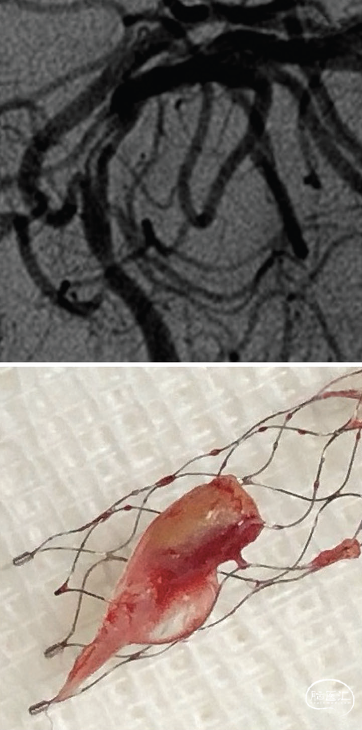 本病例在取出大块血栓后,发现大脑中动脉局部充盈缺损。取栓术中充盈缺损通常被认为是含血液成分(红细胞、纤维蛋白、血小板、白细胞)的血栓。若多次取栓未能实现血管再通,因过度取栓可能导致出血风险,可考虑药物干预(如糖蛋白IIb/IIIa受体阻滞剂、rt-PA或尿激酶)。但本例充盈缺损实为动脉壁组织,无法通过药物溶解。该组织可能源自大脑中动脉本身并导致初始血管闭塞,也可能来自颈动脉支架置入术(尽管使用远端保护装置)或初次大脑中动脉取栓时的机械损伤。无论来源如何,漂浮于血流中的不溶性动脉壁组织会阻碍血流、促进血小板黏附与纤维蛋白沉积,导致血栓复发和动脉再闭塞。因此再次行取栓支架置入术具有必要性。综上,机械取栓中的充盈缺损可能存在动脉壁等罕见成分,需及时取出此类不溶性物质以避免局部血管再闭塞。