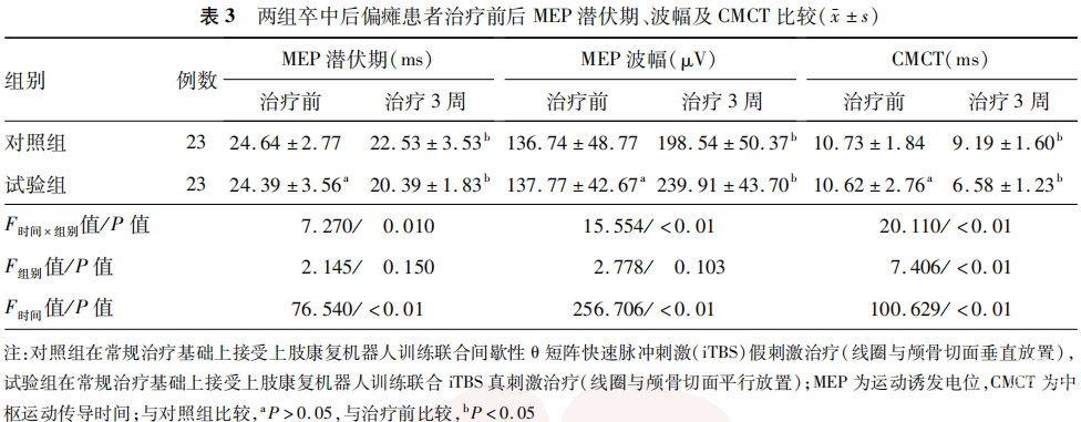 治疗前,两组患者MEP潜伏期、波幅及CMCT差异均无统计学意义(均P>0.05)。治疗3周后,两组患者MEP潜伏期、波幅及CMCT均较治疗前明显改善(均P<0.05)。两组患者MEP潜伏期、波幅、CMCT的时间及组别的交互效应均有统计学意义(均P<0.05);两组患者MEP潜伏期、波幅的组别主效应均无统计学意义(均P>0.05);两组患者CMCT的组别主效应有统计学意义(P<0.01);两组患者MEP潜伏期、波幅及CMCT的时间主效应均有统计学意义(均P<0.01)。见表3。
