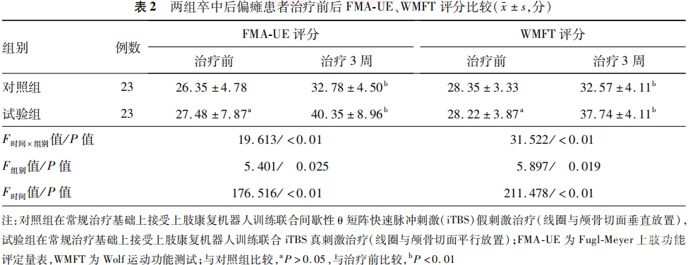 治疗前,两组患者FMA-UE、WMFT评分差异均无统计学意义(均P>0.05)。治疗3周后,两组患者的FMA-UE、WMFT评分均较治疗前升高(均P<0.01)。两组患者FMA-UE、WMFT评分的时间及组别的交互效应、组别主效应及时间主效应均有统计学意义(均P<0.05)。见表2。
