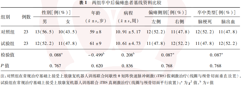 收集两组患者的基线资料,包括性别、年龄、病程、偏瘫侧别、卒中类型(脑梗死、脑出血)。