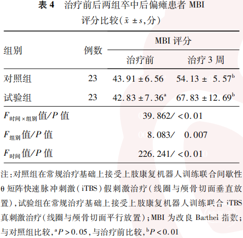 综上所述,上肢康复机器人训练联合iTBS假刺激或真刺激治疗均能改善卒中患者上肢运动功能和神经功能,提高患者日常生活活动能力,上肢康复机器人训练联合iTBS真刺激治疗较假刺激治疗改善更明显。