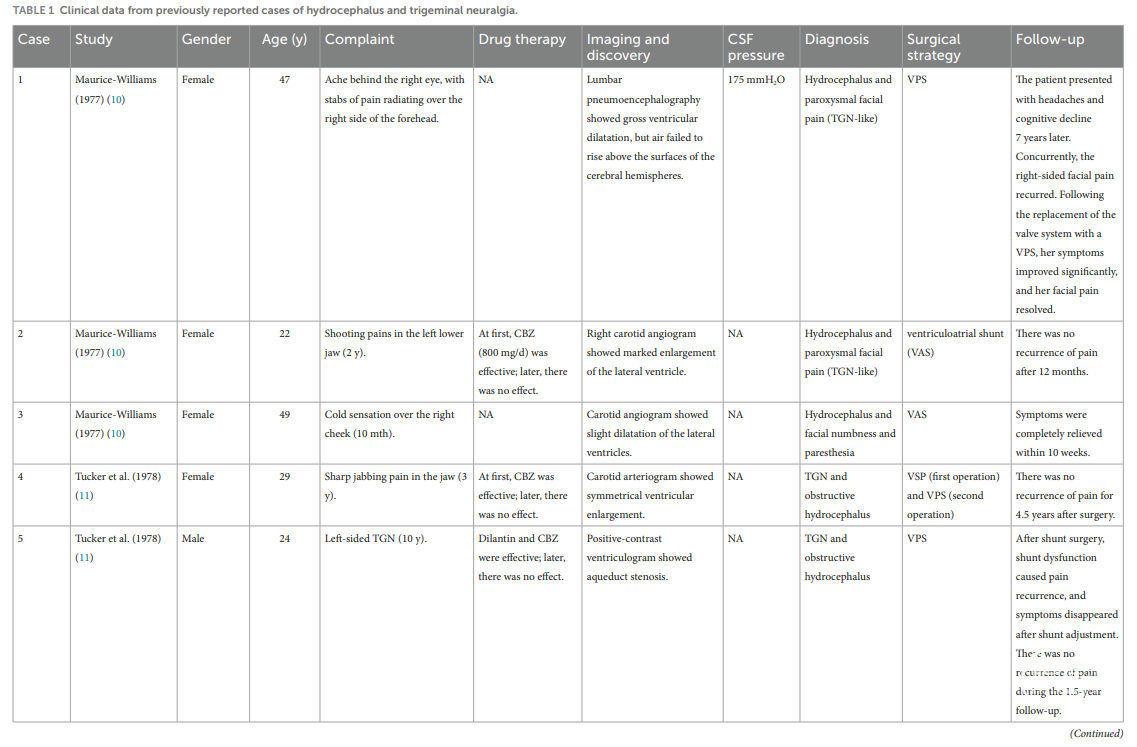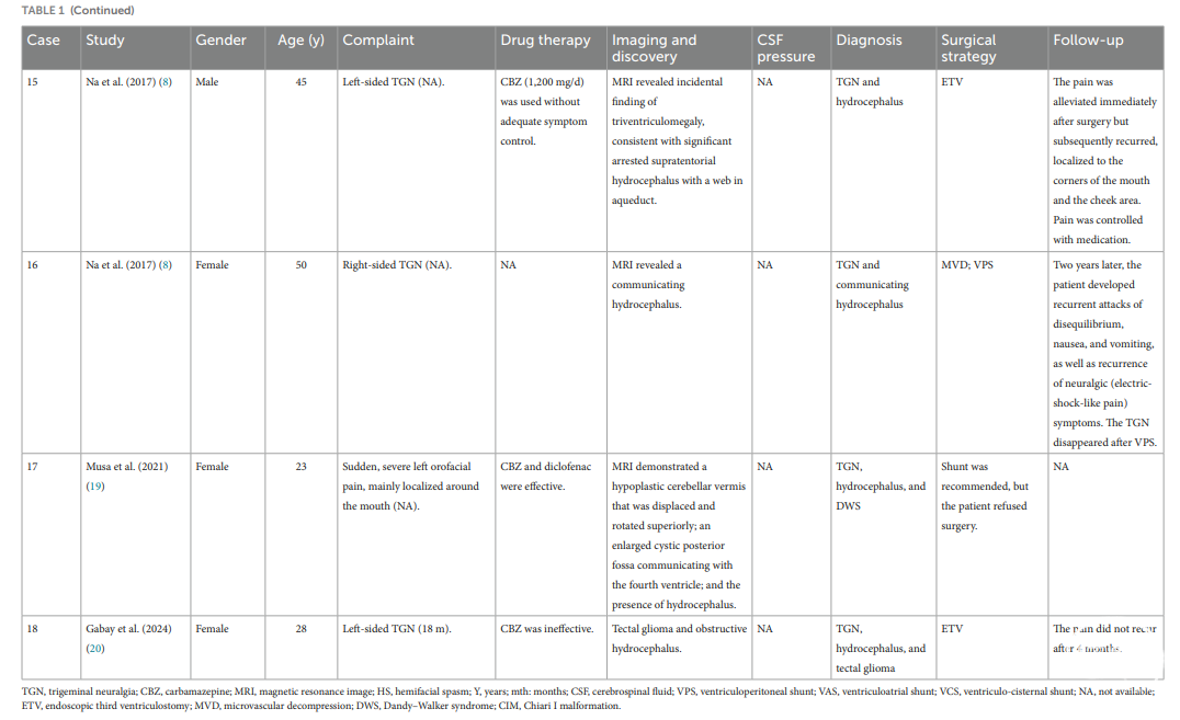 表1.既往文献报道18例脑积水相关三叉神经痛。
